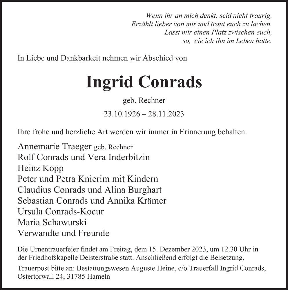 Hier finden Sie alle Traueranzeigen aus der Zeitung, die bisher für Ingrid Conrads erschienen sind. Weitere Traueranzeigen, die in der Zeitung erscheinen, werden hier ebenfalls aufgelistet