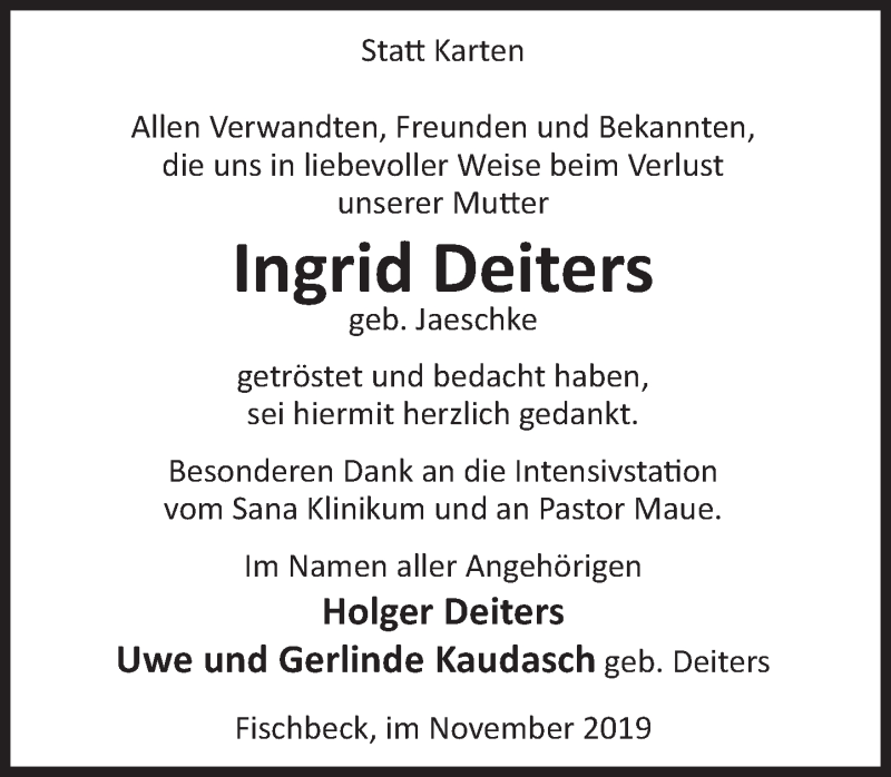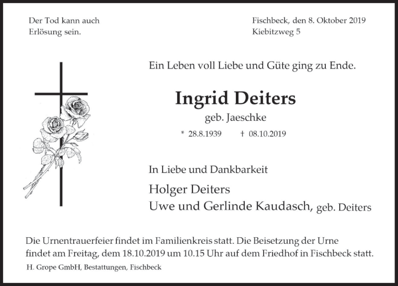Hier finden Sie alle Traueranzeigen aus der Zeitung, die bisher für Ingrid Deiters erschienen sind. Weitere Traueranzeigen, die in der Zeitung erscheinen, werden hier ebenfalls aufgelistet