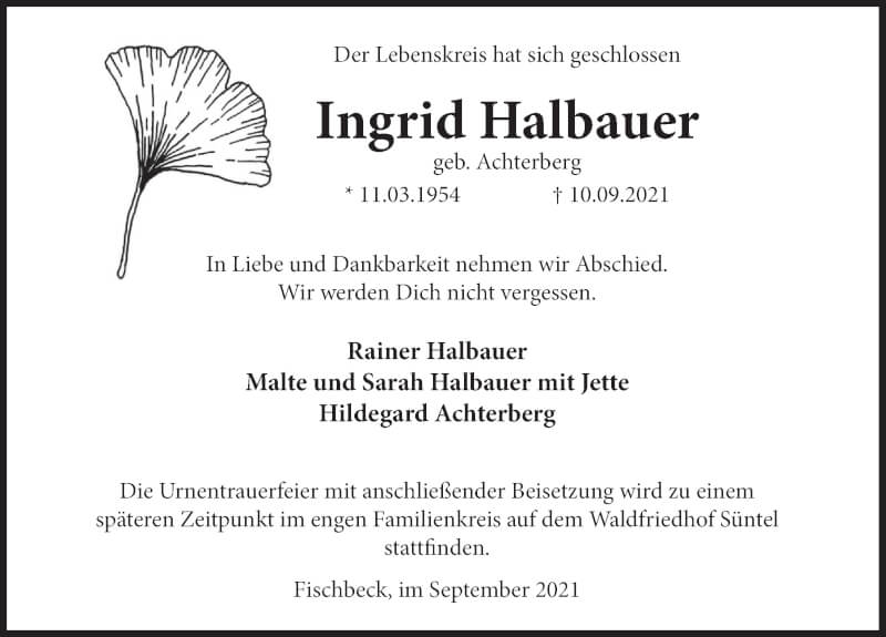 Hier finden Sie alle Traueranzeigen aus der Zeitung, die bisher für Ingrid Halbauer erschienen sind. Weitere Traueranzeigen, die in der Zeitung erscheinen, werden hier ebenfalls aufgelistet