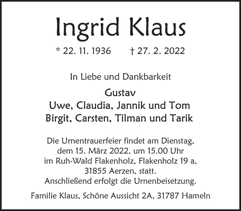 Hier finden Sie alle Traueranzeigen aus der Zeitung, die bisher für Ingrid Klaus erschienen sind. Weitere Traueranzeigen, die in der Zeitung erscheinen, werden hier ebenfalls aufgelistet