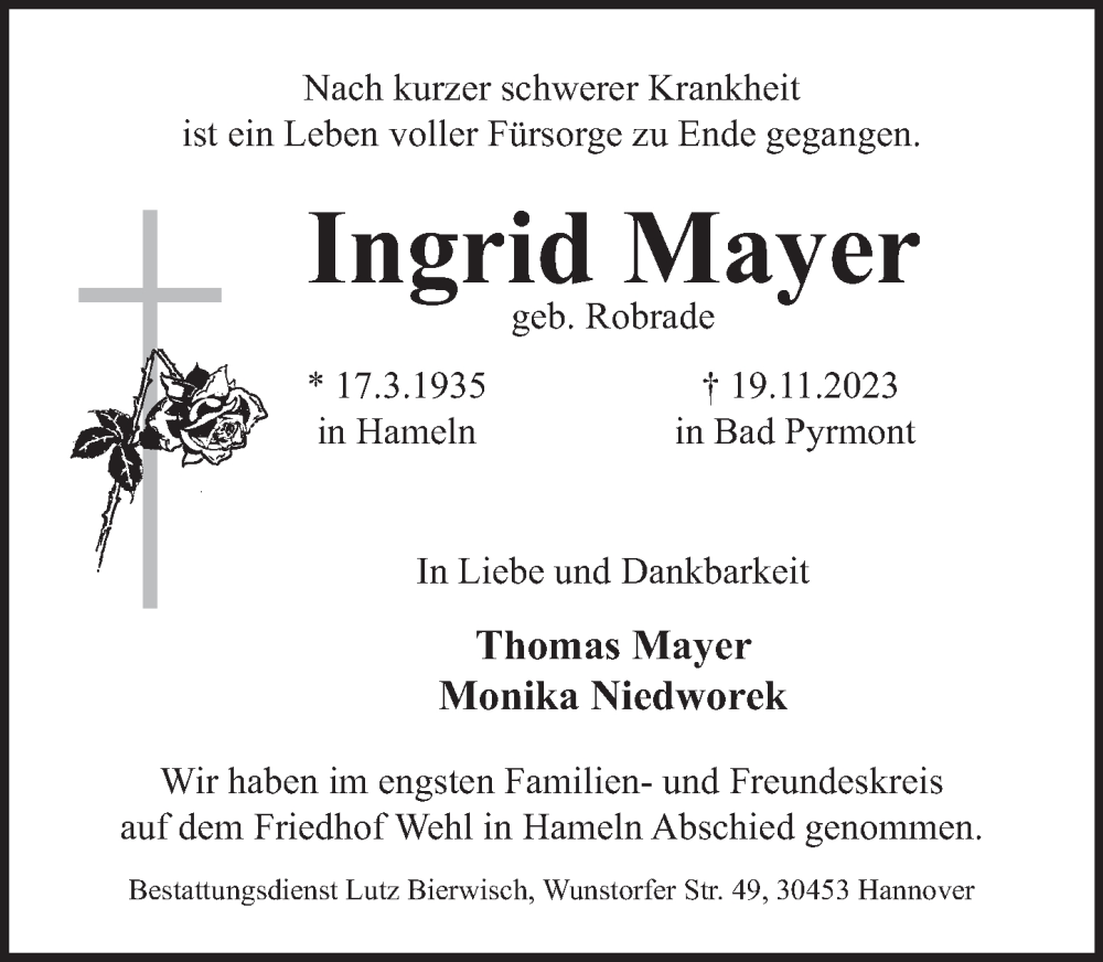 Hier finden Sie alle Traueranzeigen aus der Zeitung, die bisher für Ingrid Mayer erschienen sind. Weitere Traueranzeigen, die in der Zeitung erscheinen, werden hier ebenfalls aufgelistet