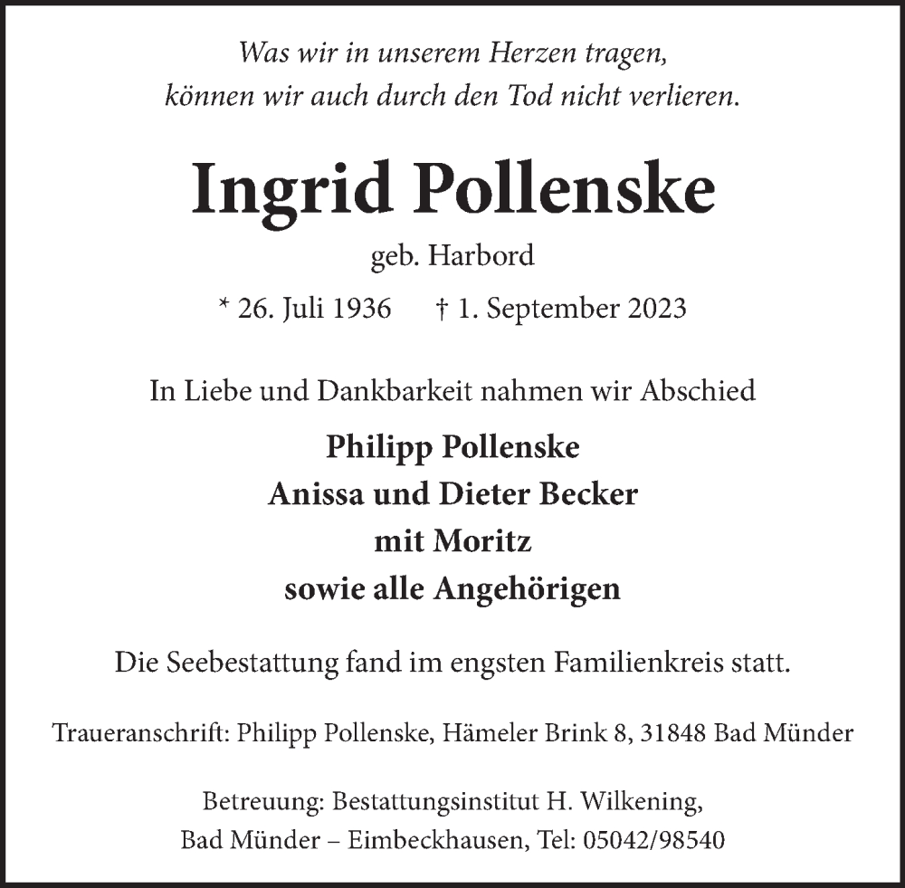 Hier finden Sie alle Traueranzeigen aus der Zeitung, die bisher für Ingrid Pollenske erschienen sind. Weitere Traueranzeigen, die in der Zeitung erscheinen, werden hier ebenfalls aufgelistet