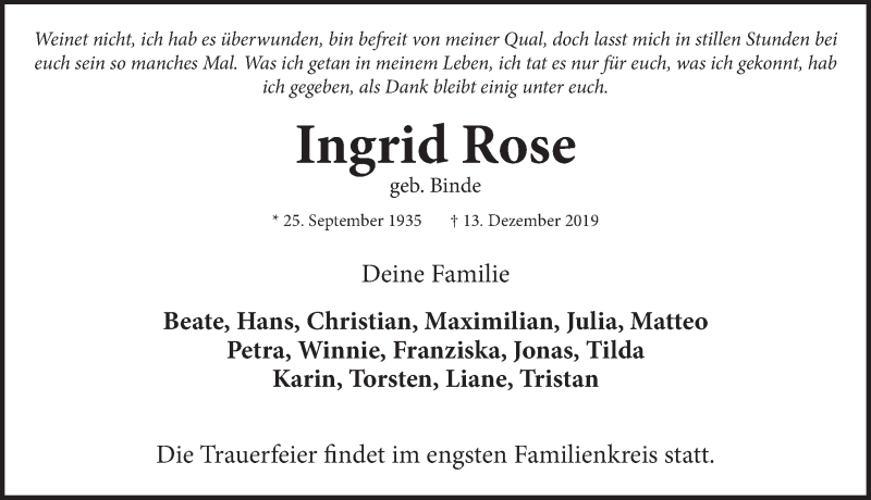 Hier finden Sie alle Traueranzeigen aus der Zeitung, die bisher für Ingrid Rose erschienen sind. Weitere Traueranzeigen, die in der Zeitung erscheinen, werden hier ebenfalls aufgelistet