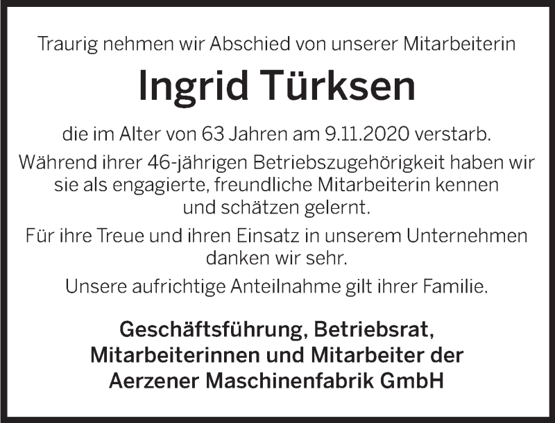 Hier finden Sie alle Traueranzeigen aus der Zeitung, die bisher für Ingrid Türksen erschienen sind. Weitere Traueranzeigen, die in der Zeitung erscheinen, werden hier ebenfalls aufgelistet