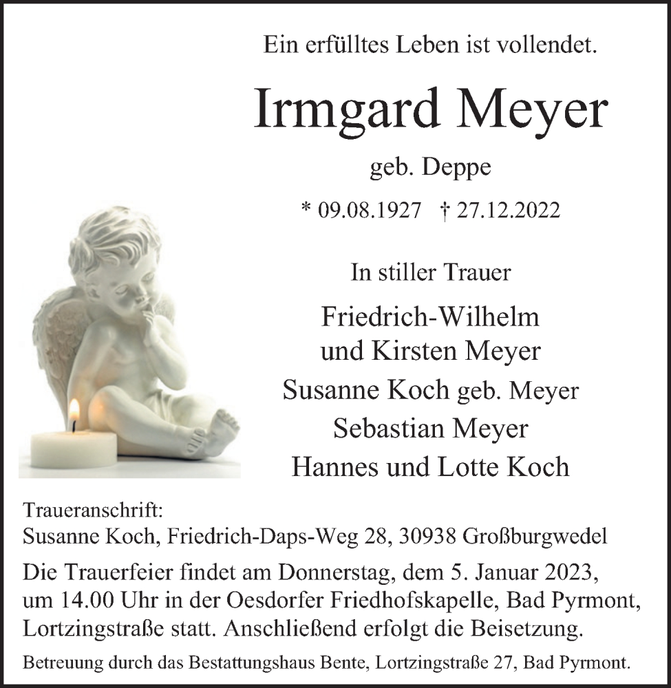 Hier finden Sie alle Traueranzeigen aus der Zeitung, die bisher für Irmgard Meyer erschienen sind. Weitere Traueranzeigen, die in der Zeitung erscheinen, werden hier ebenfalls aufgelistet