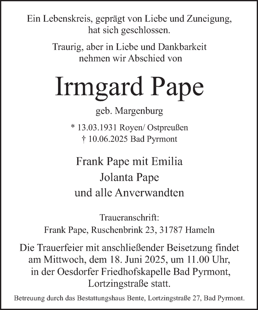 Hier finden Sie alle Traueranzeigen aus der Zeitung, die bisher für Irmgard Pape erschienen sind. Weitere Traueranzeigen, die in der Zeitung erscheinen, werden hier ebenfalls aufgelistet