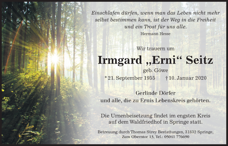 Hier finden Sie alle Traueranzeigen aus der Zeitung, die bisher für Irmgard Seitz erschienen sind. Weitere Traueranzeigen, die in der Zeitung erscheinen, werden hier ebenfalls aufgelistet
