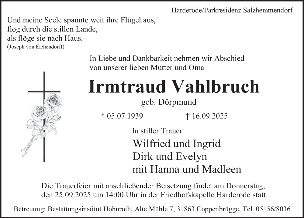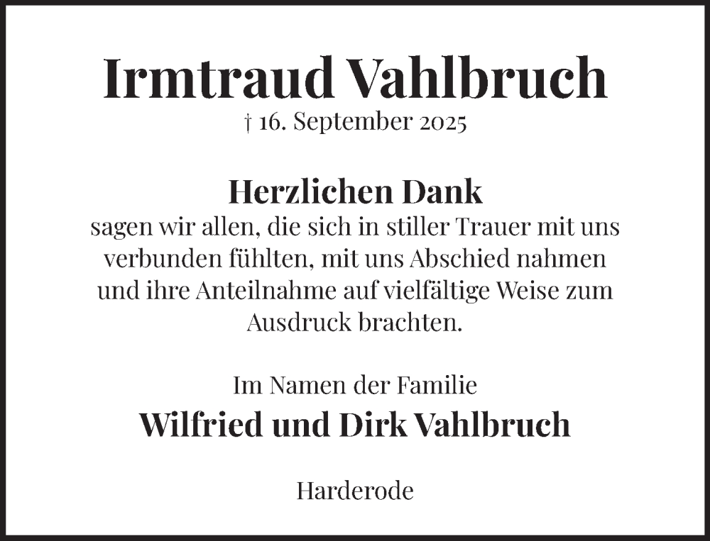 Hier finden Sie alle Traueranzeigen aus der Zeitung, die bisher für Irmtraud Vahlbruch erschienen sind. Weitere Traueranzeigen, die in der Zeitung erscheinen, werden hier ebenfalls aufgelistet