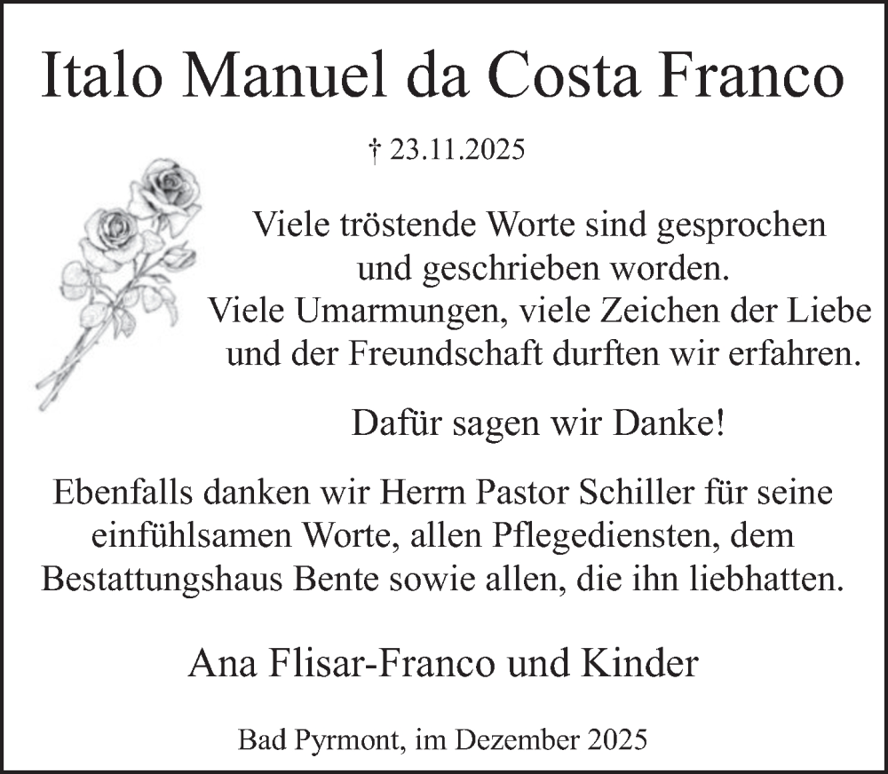 Hier finden Sie alle Traueranzeigen aus der Zeitung, die bisher für Italo Manuel da Costa Franco erschienen sind. Weitere Traueranzeigen, die in der Zeitung erscheinen, werden hier ebenfalls aufgelistet