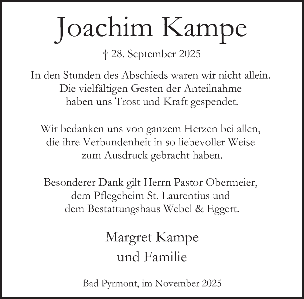 Hier finden Sie alle Traueranzeigen aus der Zeitung, die bisher für Joachim Kampe erschienen sind. Weitere Traueranzeigen, die in der Zeitung erscheinen, werden hier ebenfalls aufgelistet