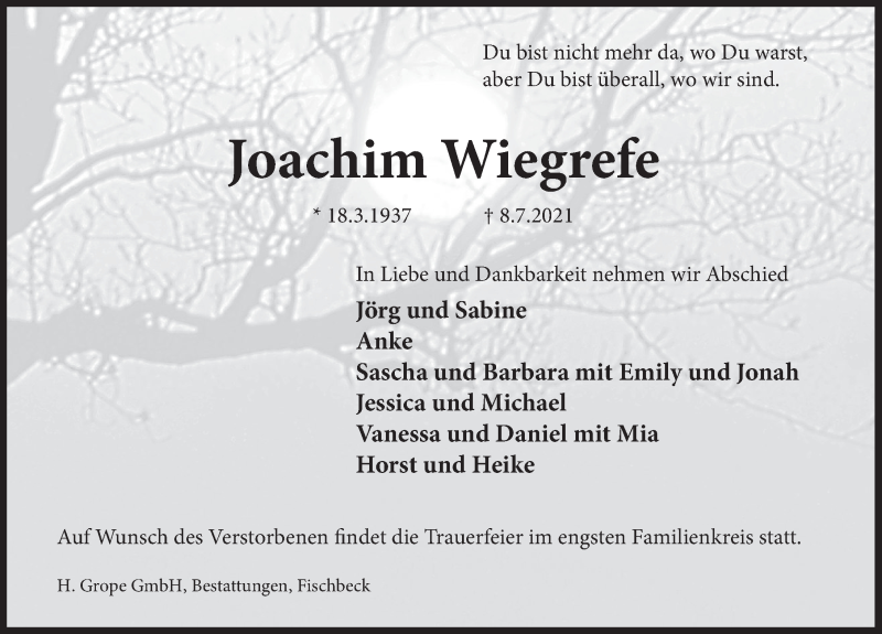 Hier finden Sie alle Traueranzeigen aus der Zeitung, die bisher für Joachim Wiegrefe erschienen sind. Weitere Traueranzeigen, die in der Zeitung erscheinen, werden hier ebenfalls aufgelistet