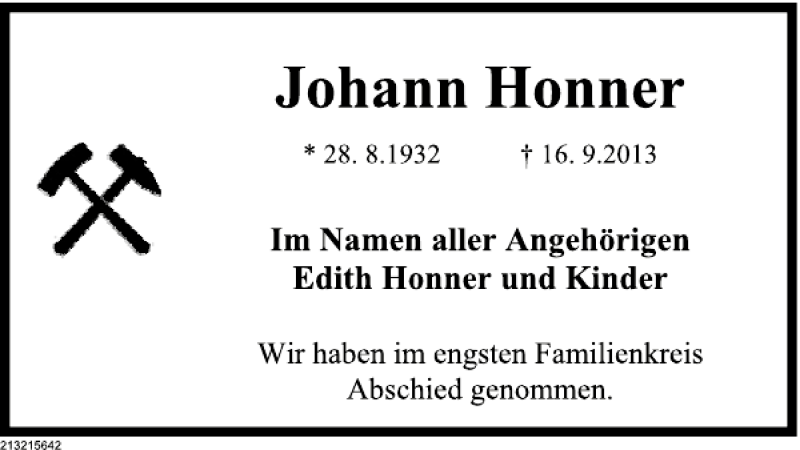 Hier finden Sie alle Traueranzeigen aus der Zeitung, die bisher für Johann Honner erschienen sind. Weitere Traueranzeigen, die in der Zeitung erscheinen, werden hier ebenfalls aufgelistet