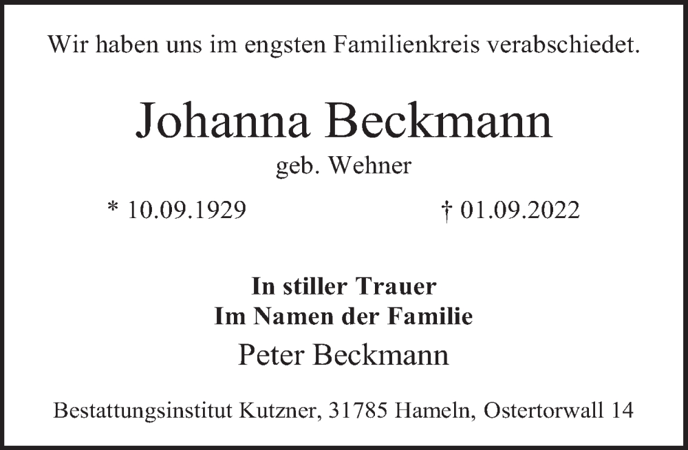 Hier finden Sie alle Traueranzeigen aus der Zeitung, die bisher für Johanna Beckmann erschienen sind. Weitere Traueranzeigen, die in der Zeitung erscheinen, werden hier ebenfalls aufgelistet