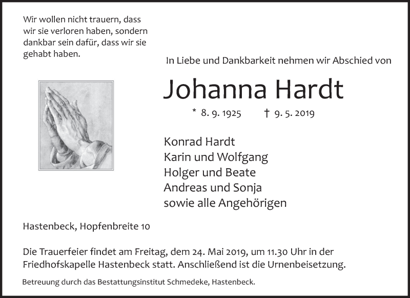 Hier finden Sie alle Traueranzeigen aus der Zeitung, die bisher für Johanna Hardt erschienen sind. Weitere Traueranzeigen, die in der Zeitung erscheinen, werden hier ebenfalls aufgelistet