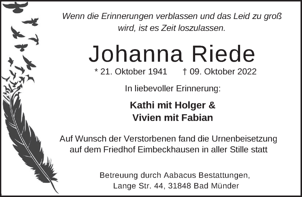 Hier finden Sie alle Traueranzeigen aus der Zeitung, die bisher für Johanna Riede erschienen sind. Weitere Traueranzeigen, die in der Zeitung erscheinen, werden hier ebenfalls aufgelistet