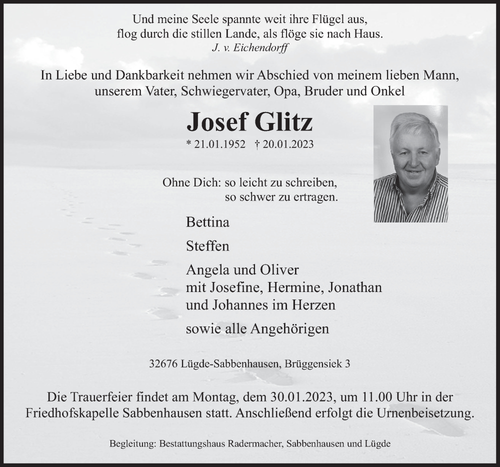 Hier finden Sie alle Traueranzeigen aus der Zeitung, die bisher für Josef Glitz erschienen sind. Weitere Traueranzeigen, die in der Zeitung erscheinen, werden hier ebenfalls aufgelistet