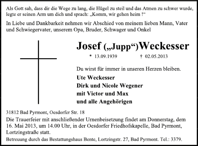 Hier finden Sie alle Traueranzeigen aus der Zeitung, die bisher für Josef Weckesser erschienen sind. Weitere Traueranzeigen, die in der Zeitung erscheinen, werden hier ebenfalls aufgelistet