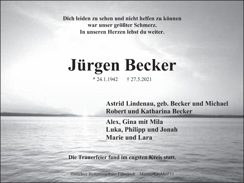 Hier finden Sie alle Traueranzeigen aus der Zeitung, die bisher für Jürgen Becker erschienen sind. Weitere Traueranzeigen, die in der Zeitung erscheinen, werden hier ebenfalls aufgelistet