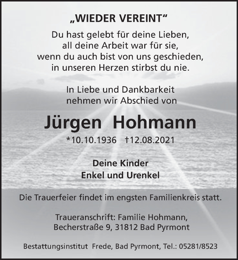 Hier finden Sie alle Traueranzeigen aus der Zeitung, die bisher für Jürgen Hohmann erschienen sind. Weitere Traueranzeigen, die in der Zeitung erscheinen, werden hier ebenfalls aufgelistet