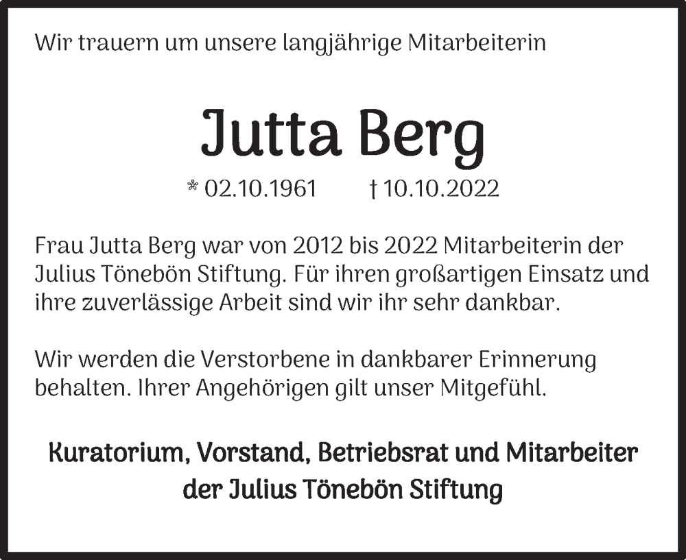 Hier finden Sie alle Traueranzeigen aus der Zeitung, die bisher für Jutta Berg erschienen sind. Weitere Traueranzeigen, die in der Zeitung erscheinen, werden hier ebenfalls aufgelistet