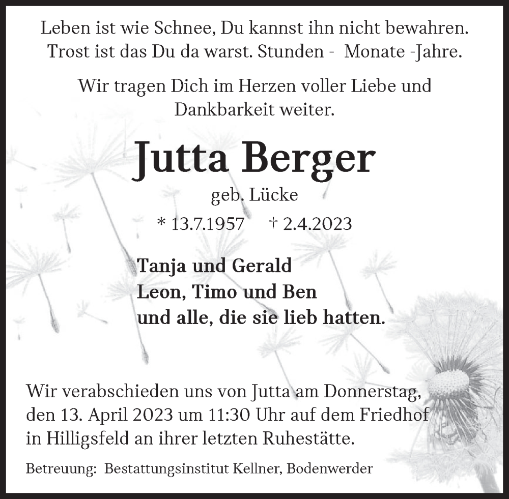 Hier finden Sie alle Traueranzeigen aus der Zeitung, die bisher für Jutta Berger erschienen sind. Weitere Traueranzeigen, die in der Zeitung erscheinen, werden hier ebenfalls aufgelistet