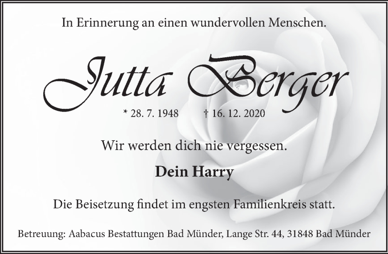 Hier finden Sie alle Traueranzeigen aus der Zeitung, die bisher für Jutta Berger erschienen sind. Weitere Traueranzeigen, die in der Zeitung erscheinen, werden hier ebenfalls aufgelistet