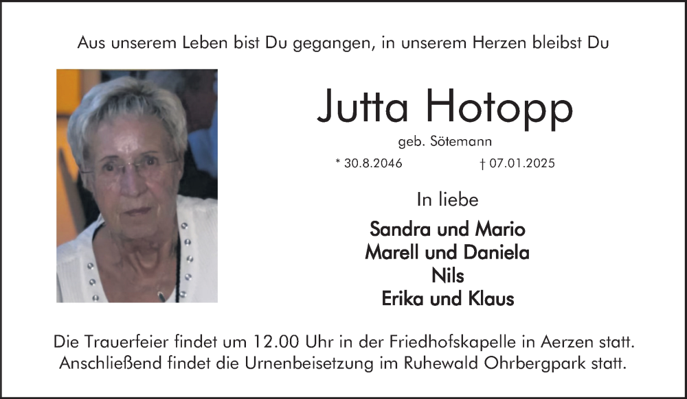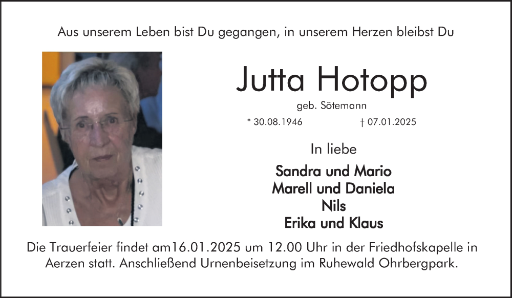 Hier finden Sie alle Traueranzeigen aus der Zeitung, die bisher für Jutta Hotopp erschienen sind. Weitere Traueranzeigen, die in der Zeitung erscheinen, werden hier ebenfalls aufgelistet