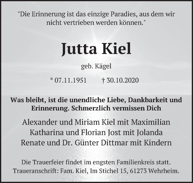 Hier finden Sie alle Traueranzeigen aus der Zeitung, die bisher für Jutta Kiel erschienen sind. Weitere Traueranzeigen, die in der Zeitung erscheinen, werden hier ebenfalls aufgelistet