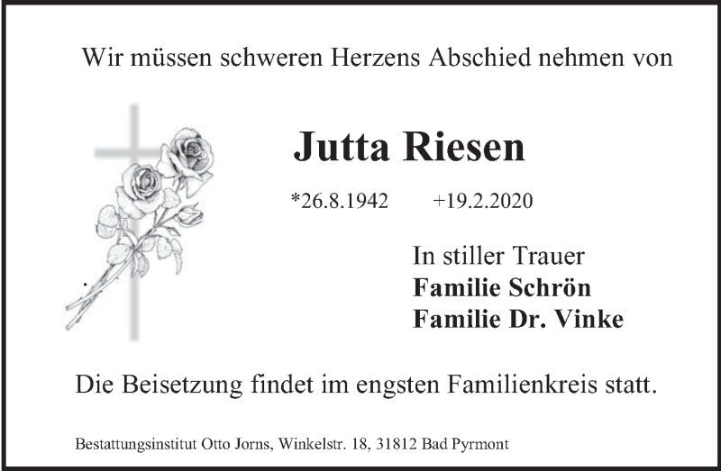 Hier finden Sie alle Traueranzeigen aus der Zeitung, die bisher für Jutta Riesen erschienen sind. Weitere Traueranzeigen, die in der Zeitung erscheinen, werden hier ebenfalls aufgelistet