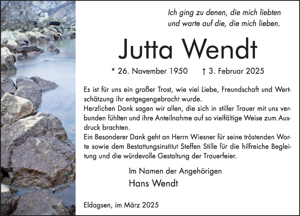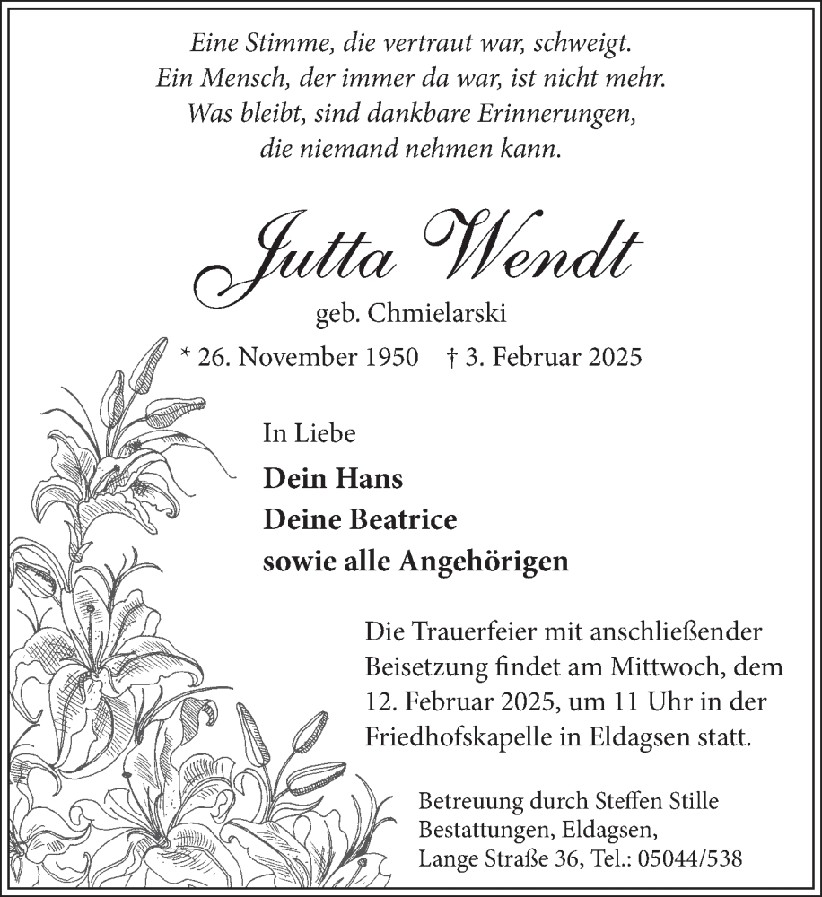 Hier finden Sie alle Traueranzeigen aus der Zeitung, die bisher für Jutta Wendt erschienen sind. Weitere Traueranzeigen, die in der Zeitung erscheinen, werden hier ebenfalls aufgelistet