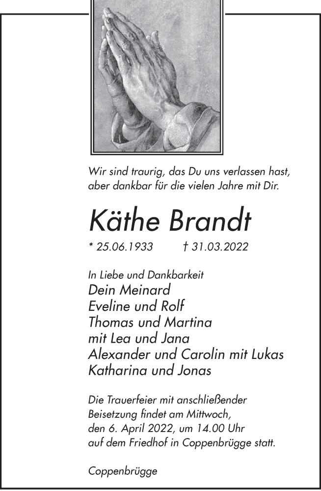 Hier finden Sie alle Traueranzeigen aus der Zeitung, die bisher für Käthe Brandt erschienen sind. Weitere Traueranzeigen, die in der Zeitung erscheinen, werden hier ebenfalls aufgelistet
