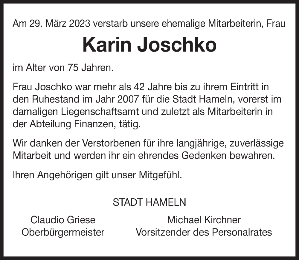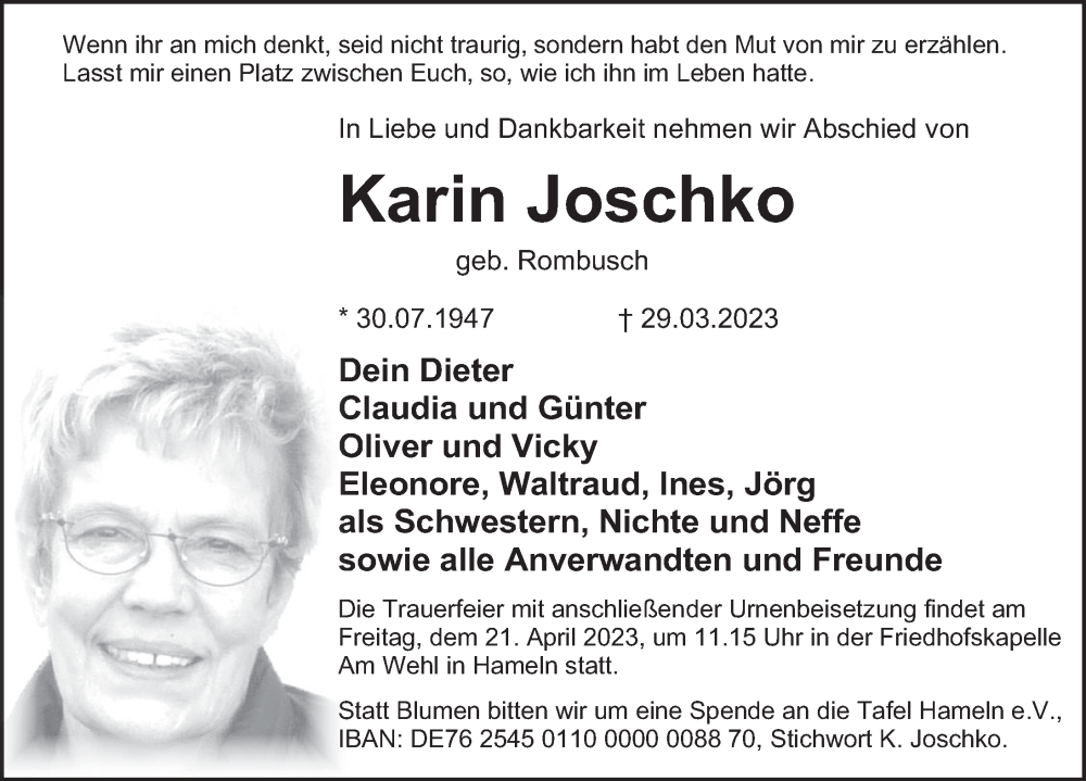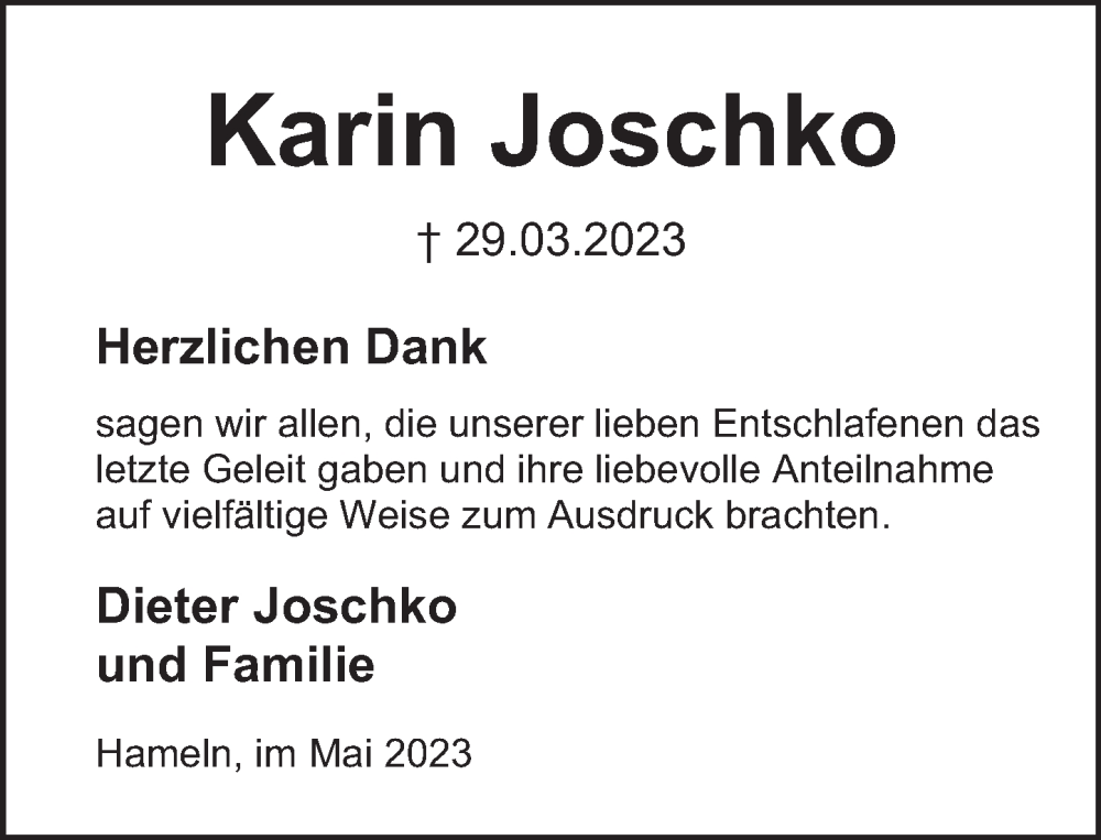Hier finden Sie alle Traueranzeigen aus der Zeitung, die bisher für Karin Joschko erschienen sind. Weitere Traueranzeigen, die in der Zeitung erscheinen, werden hier ebenfalls aufgelistet