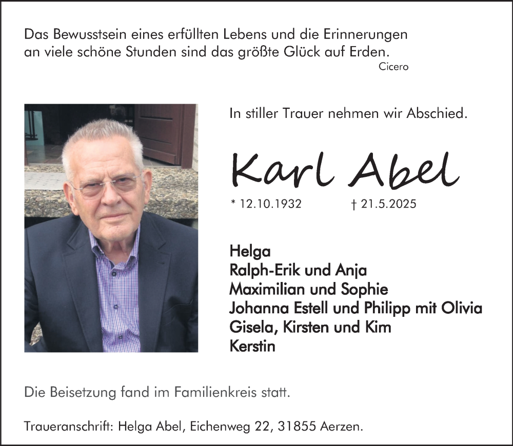 Hier finden Sie alle Traueranzeigen aus der Zeitung, die bisher für Karl Abel erschienen sind. Weitere Traueranzeigen, die in der Zeitung erscheinen, werden hier ebenfalls aufgelistet