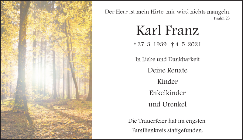 Hier finden Sie alle Traueranzeigen aus der Zeitung, die bisher für Karl Franz erschienen sind. Weitere Traueranzeigen, die in der Zeitung erscheinen, werden hier ebenfalls aufgelistet