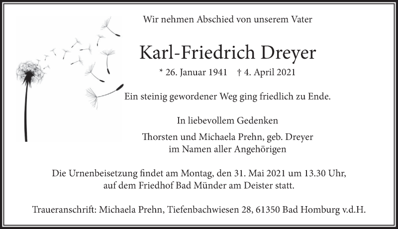 Hier finden Sie alle Traueranzeigen aus der Zeitung, die bisher für Karl-Friedrich Dreyer erschienen sind. Weitere Traueranzeigen, die in der Zeitung erscheinen, werden hier ebenfalls aufgelistet