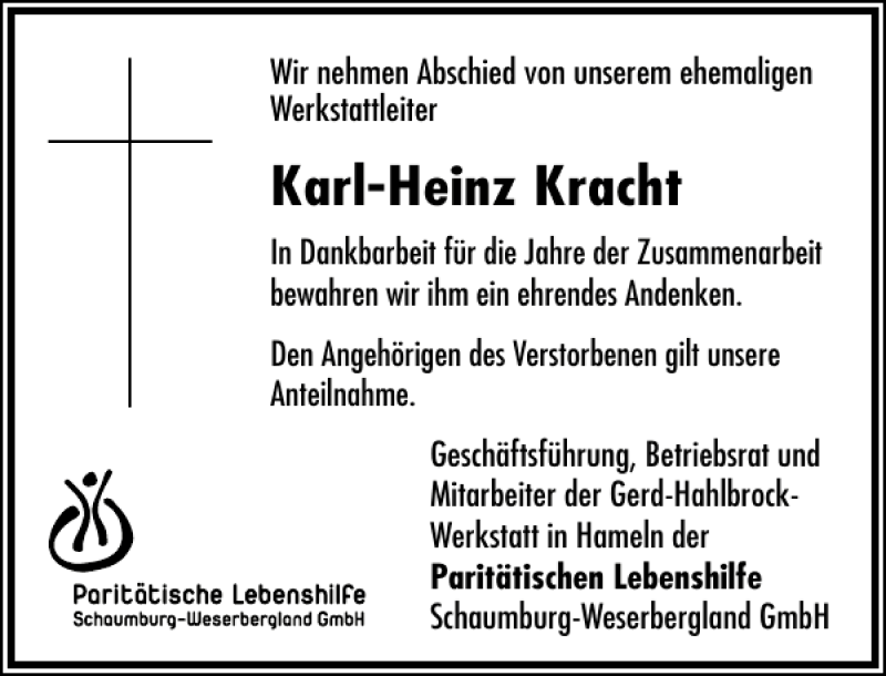 Hier finden Sie alle Traueranzeigen aus der Zeitung, die bisher für Karl-Heinz Kracht erschienen sind. Weitere Traueranzeigen, die in der Zeitung erscheinen, werden hier ebenfalls aufgelistet