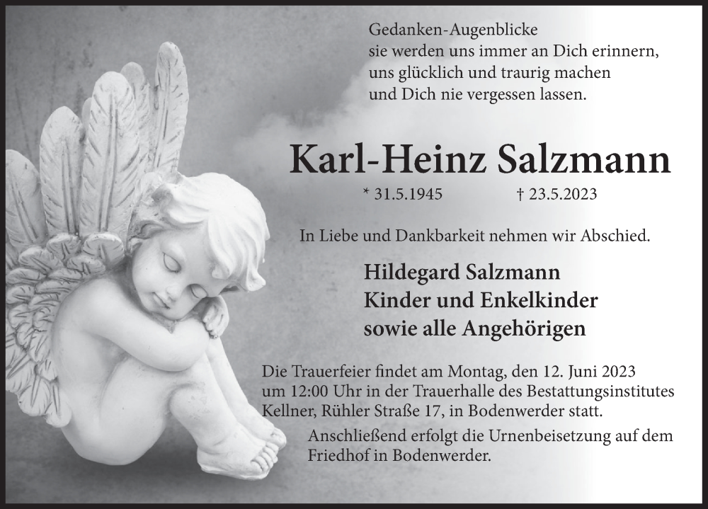 Hier finden Sie alle Traueranzeigen aus der Zeitung, die bisher für Karl-Heinz Salzmann erschienen sind. Weitere Traueranzeigen, die in der Zeitung erscheinen, werden hier ebenfalls aufgelistet