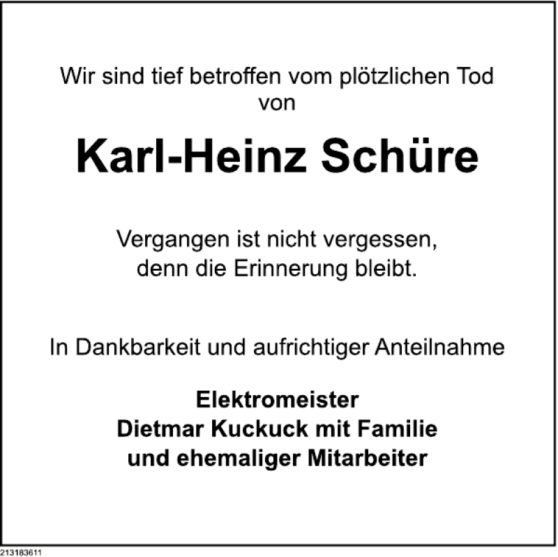 Hier finden Sie alle Traueranzeigen aus der Zeitung, die bisher für Karl-Heinz Schüre erschienen sind. Weitere Traueranzeigen, die in der Zeitung erscheinen, werden hier ebenfalls aufgelistet