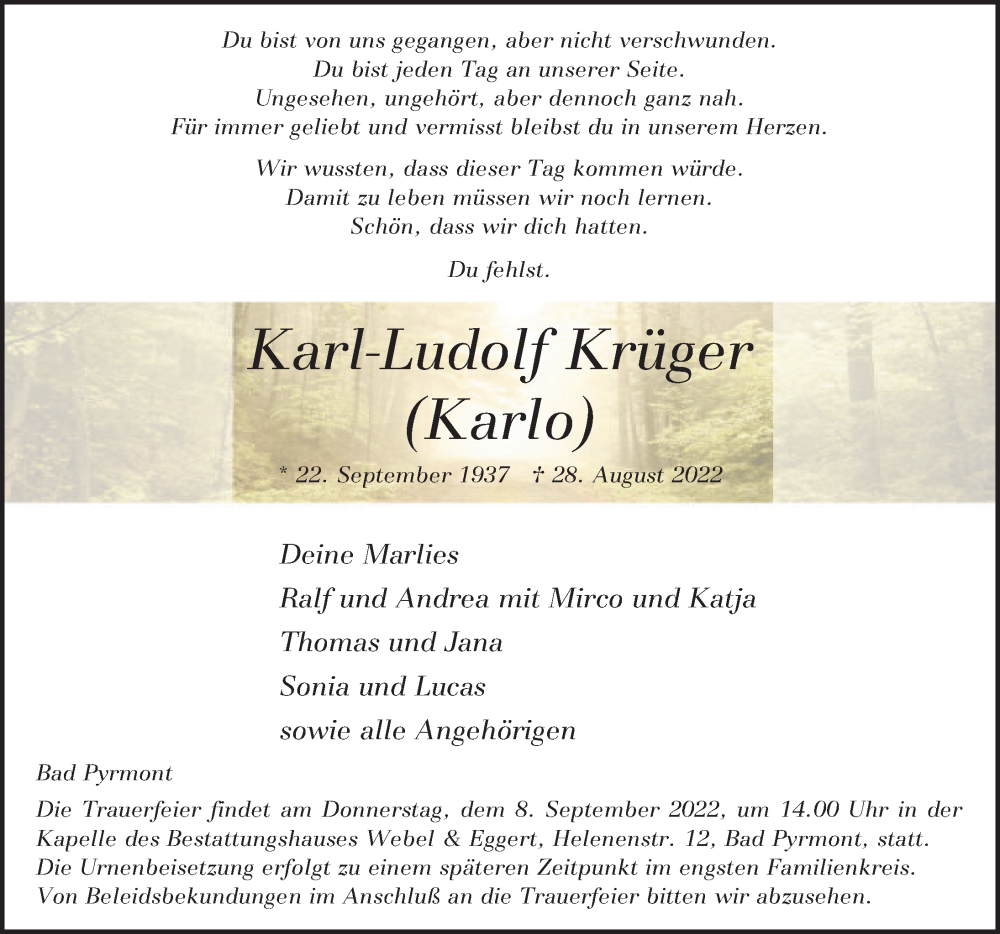 Hier finden Sie alle Traueranzeigen aus der Zeitung, die bisher für Karl-Ludolf Krüger erschienen sind. Weitere Traueranzeigen, die in der Zeitung erscheinen, werden hier ebenfalls aufgelistet