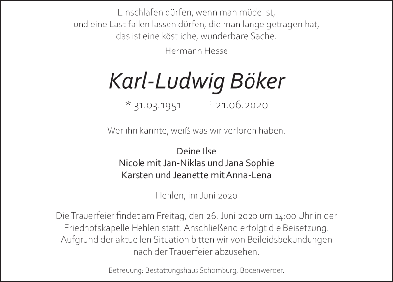 Hier finden Sie alle Traueranzeigen aus der Zeitung, die bisher für Karl-Ludwig Böker erschienen sind. Weitere Traueranzeigen, die in der Zeitung erscheinen, werden hier ebenfalls aufgelistet