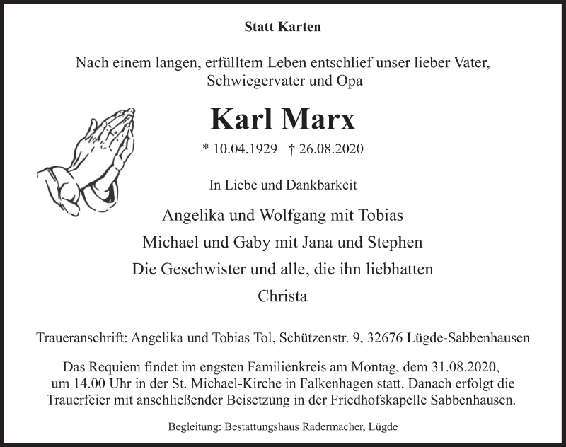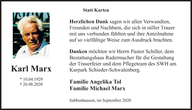 Hier finden Sie alle Traueranzeigen aus der Zeitung, die bisher für Karl Marx erschienen sind. Weitere Traueranzeigen, die in der Zeitung erscheinen, werden hier ebenfalls aufgelistet