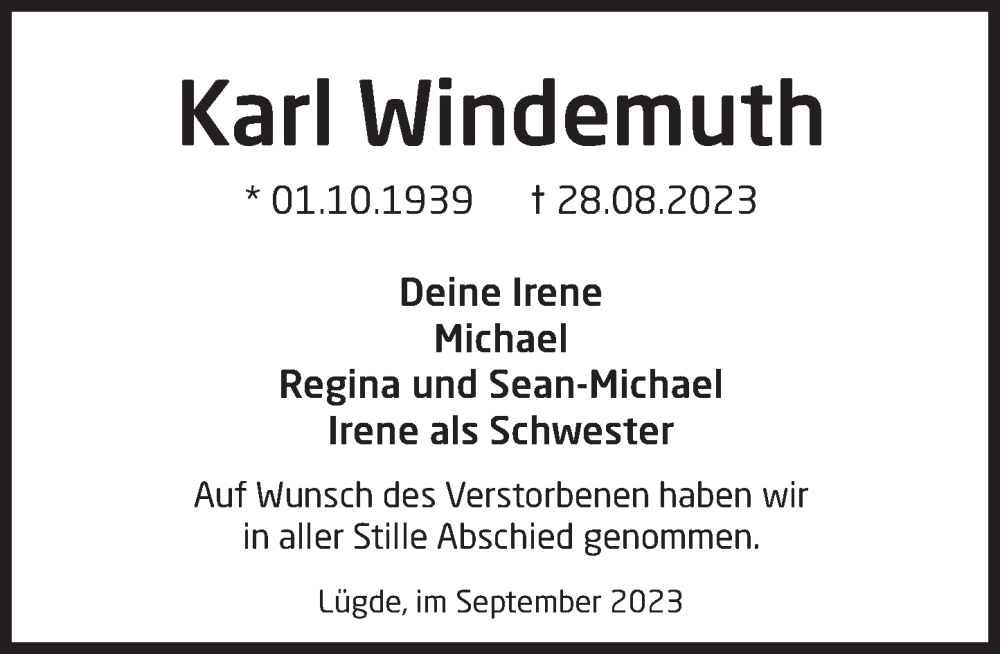 Hier finden Sie alle Traueranzeigen aus der Zeitung, die bisher für Karl Windemuth erschienen sind. Weitere Traueranzeigen, die in der Zeitung erscheinen, werden hier ebenfalls aufgelistet