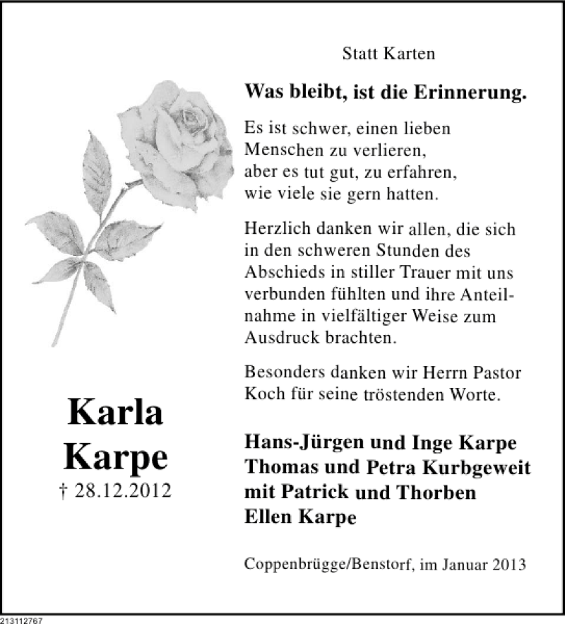Hier finden Sie alle Traueranzeigen aus der Zeitung, die bisher für Karla Karpe erschienen sind. Weitere Traueranzeigen, die in der Zeitung erscheinen, werden hier ebenfalls aufgelistet