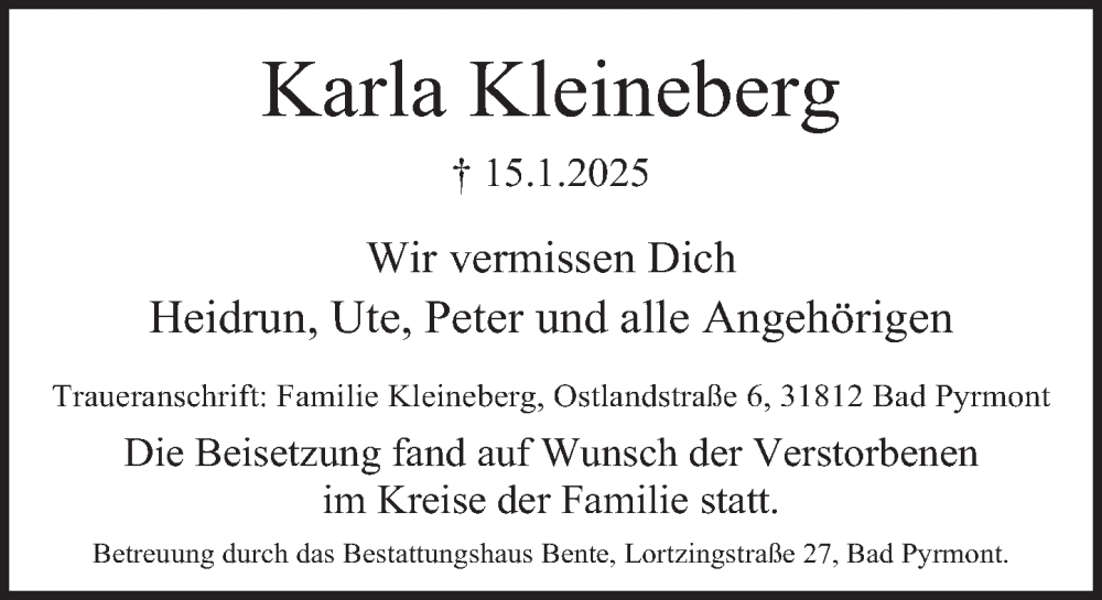 Hier finden Sie alle Traueranzeigen aus der Zeitung, die bisher für Karla Kleineberg erschienen sind. Weitere Traueranzeigen, die in der Zeitung erscheinen, werden hier ebenfalls aufgelistet