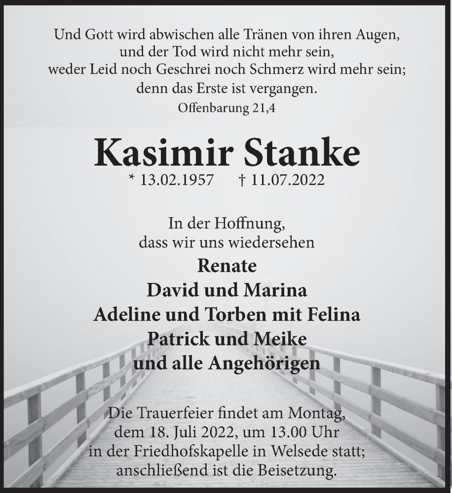 Hier finden Sie alle Traueranzeigen aus der Zeitung, die bisher für Kasimir Stanke erschienen sind. Weitere Traueranzeigen, die in der Zeitung erscheinen, werden hier ebenfalls aufgelistet