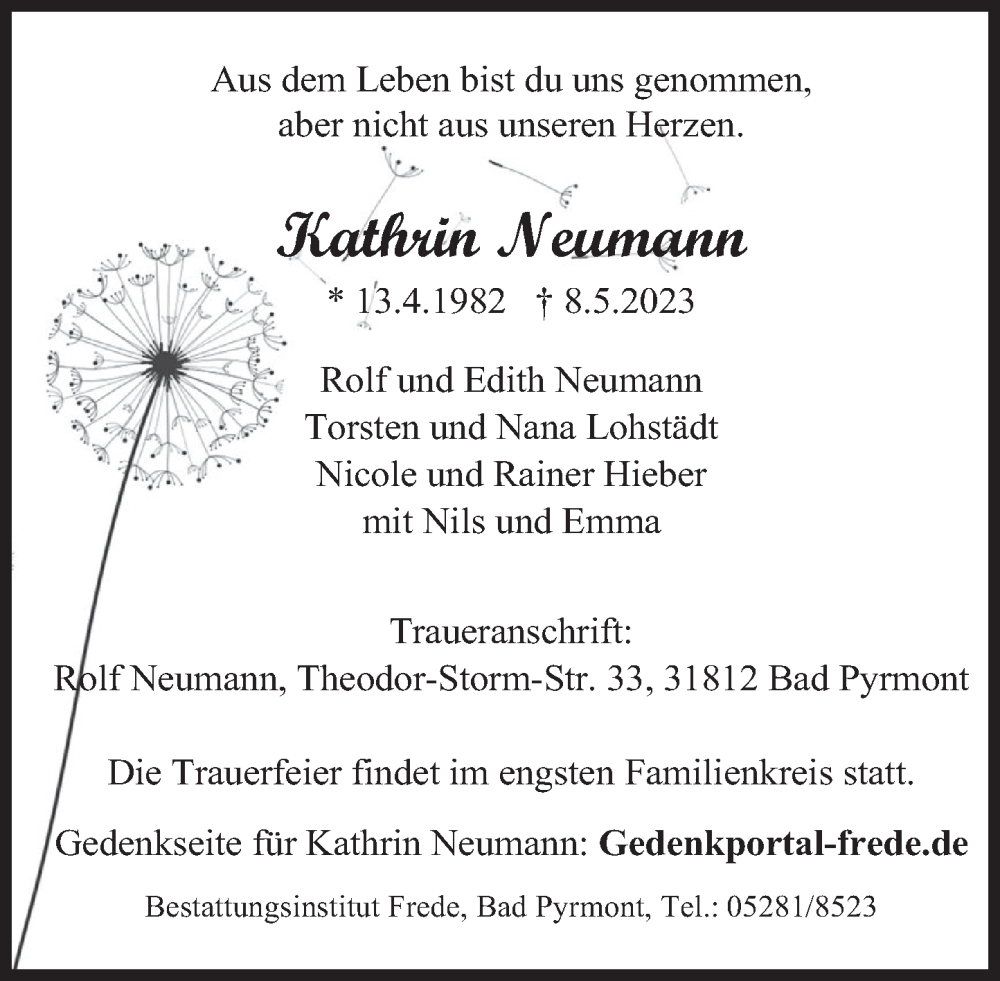 Hier finden Sie alle Traueranzeigen aus der Zeitung, die bisher für Kathrin Neumann erschienen sind. Weitere Traueranzeigen, die in der Zeitung erscheinen, werden hier ebenfalls aufgelistet