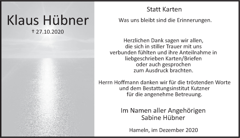 Hier finden Sie alle Traueranzeigen aus der Zeitung, die bisher für Klaus Hübner erschienen sind. Weitere Traueranzeigen, die in der Zeitung erscheinen, werden hier ebenfalls aufgelistet