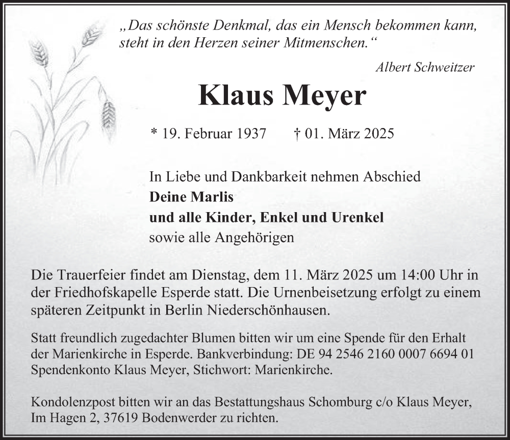 Hier finden Sie alle Traueranzeigen aus der Zeitung, die bisher für Klaus Meyer erschienen sind. Weitere Traueranzeigen, die in der Zeitung erscheinen, werden hier ebenfalls aufgelistet