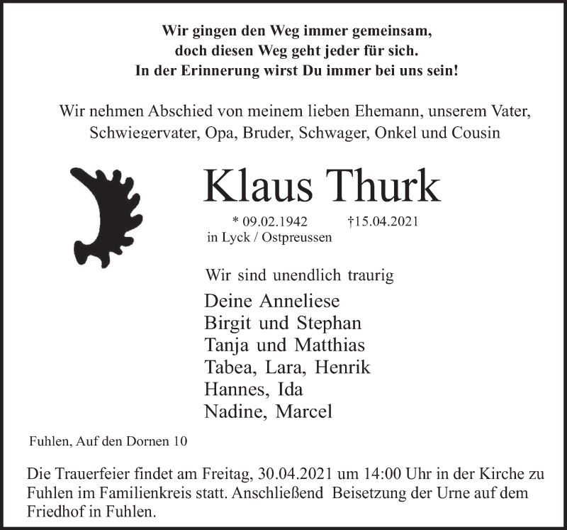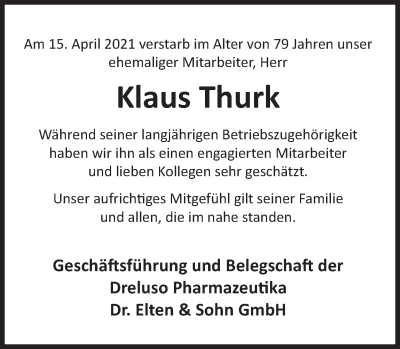 Hier finden Sie alle Traueranzeigen aus der Zeitung, die bisher für Klaus Thurk erschienen sind. Weitere Traueranzeigen, die in der Zeitung erscheinen, werden hier ebenfalls aufgelistet