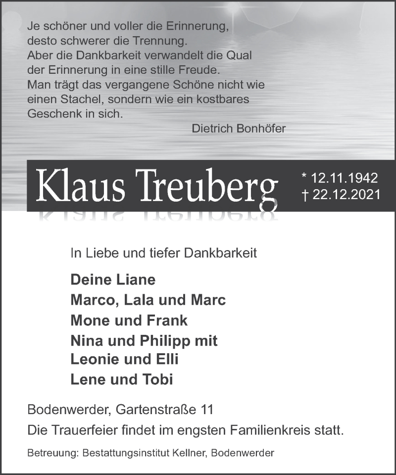 Hier finden Sie alle Traueranzeigen aus der Zeitung, die bisher für Klaus Treuberg erschienen sind. Weitere Traueranzeigen, die in der Zeitung erscheinen, werden hier ebenfalls aufgelistet